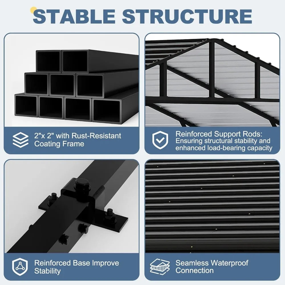 【Safe & Durable】 Our metal carport soft and durable rubber decorations to the edge of the roof further enhances overall safety and prevents potential scratches or injuries. It's not only ensure a safer structure, but also extend the durability of the carport.