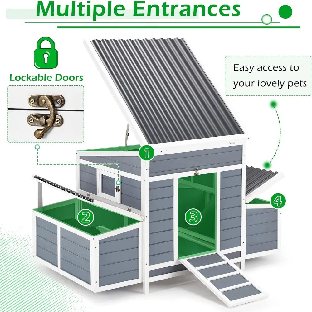 - Multiple Entrances --1 side vent and 4 entrances to maintain good air circulation and easy access to your lovely chickens. The reasonable construction contributes to the health of the chickens and thus increases the productivity of the chickens