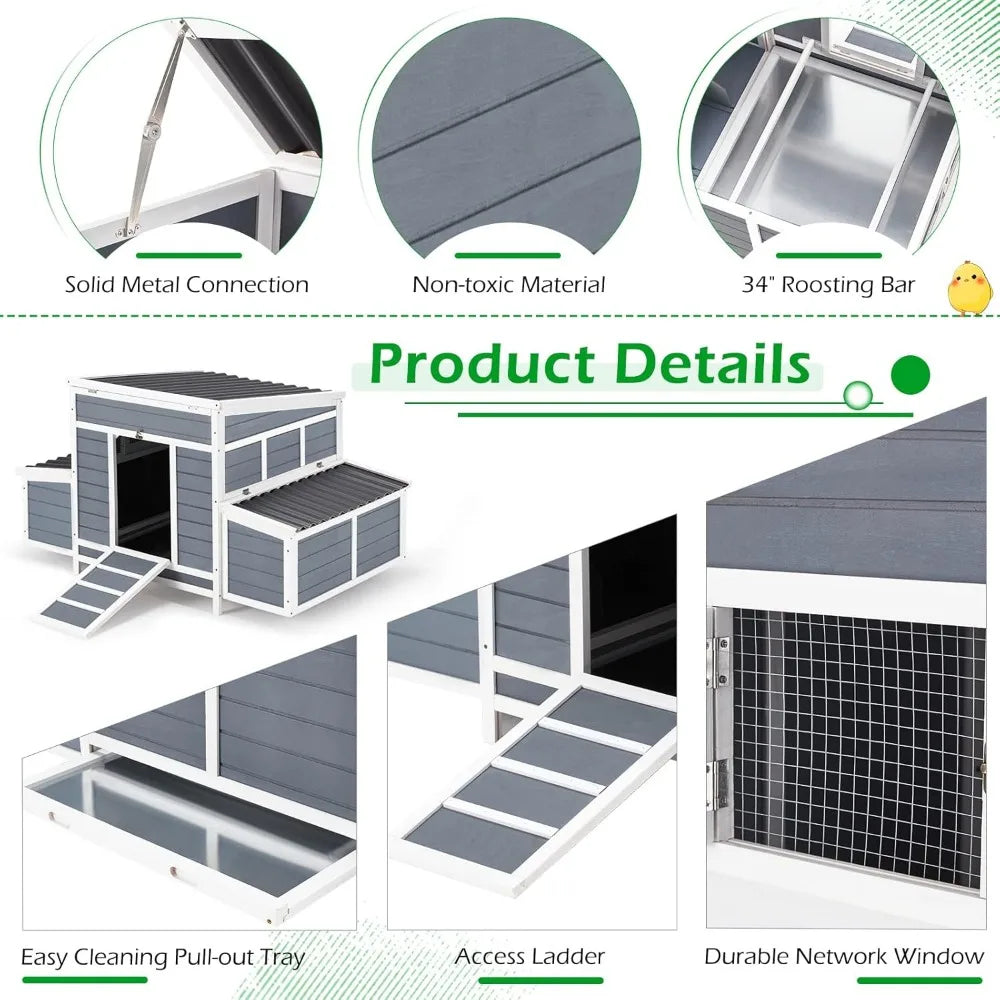 - A Comfortable Home For Hens -- wooden hen house comes with 6 large nesting boxes, and ramps to give your pet a comfortable life. The stylish look and color match your courtyard and complement the surroundings.